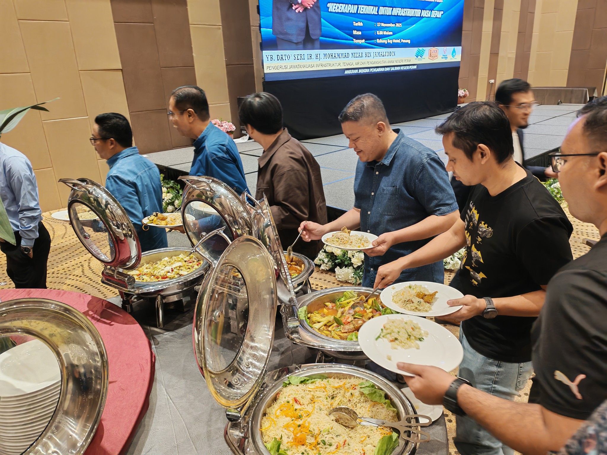 17 November 2025, Teluk Bahang - Dato' Seri Ir. Hj. Mohammad Nizar Jamaluddin, Pengerusi Jawatankuasa Infrastruktur, Tenaga, Air dan Pengangkutan Awam (INTAP) Negeri Perak telah hadir bersama isteri ke Majlis Makan Malam Persidangan Jurutera dan Program Pemantapan Organisasi yang diadakan di Bahang Bay Hotel, Pulau Pinang.