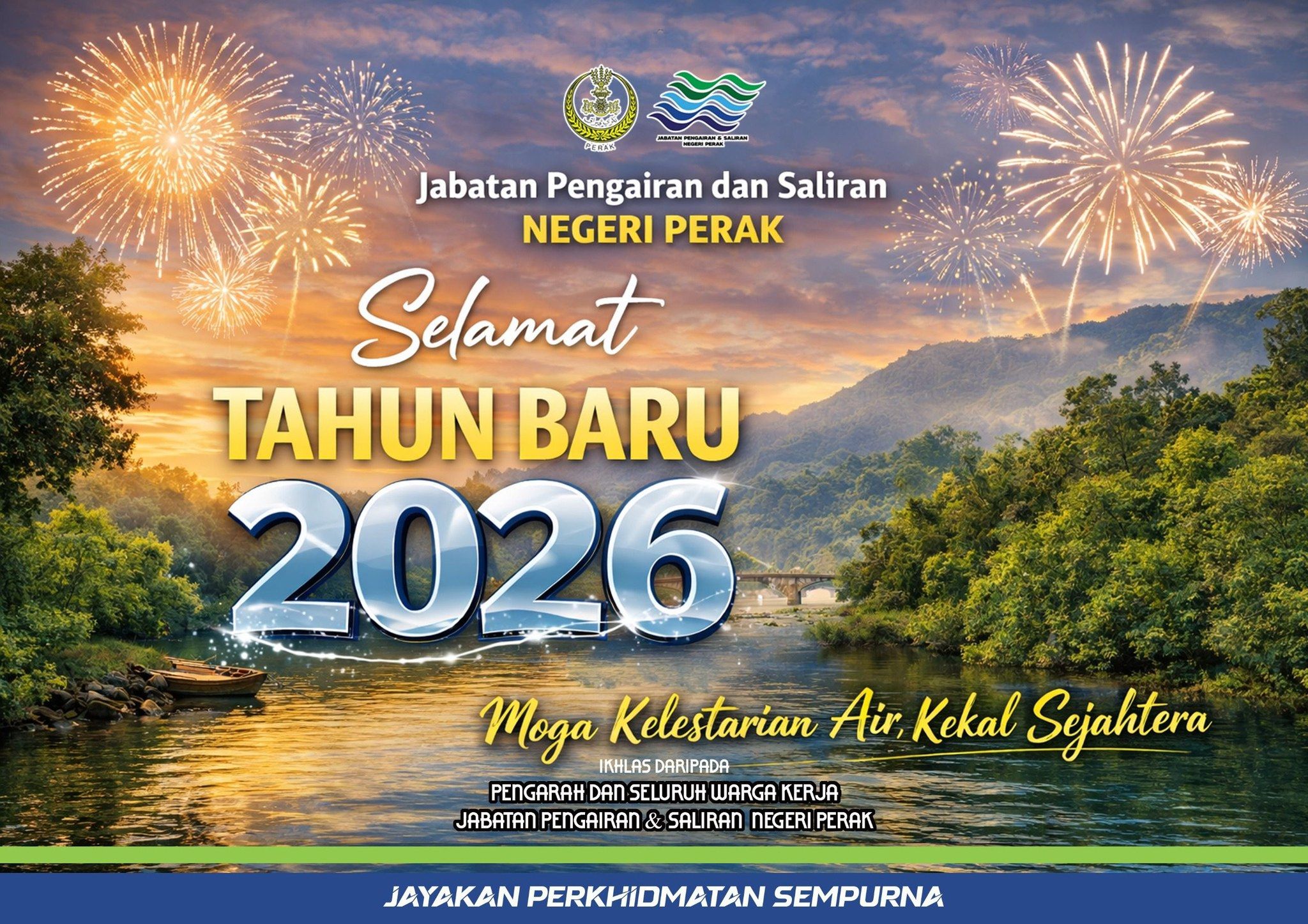 Pengarah Pengairan dan Saliran Negeri Perak, YBrs. Ir. Dr. Asnor Muizan bin Dato’ Hj. Ishak serta seluruh warga kerja Jabatan Pengairan dan Saliran Negeri Perak mengucapkan Selamat Menyambut Tahun Baharu 2026.